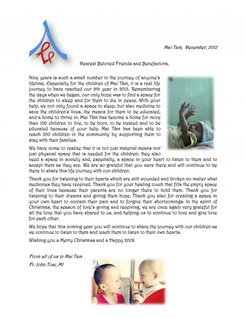 On behalf of Mai Tam House of Hope Saigon/HCMC, Jill and I extend our deep felt gratitude for your support this year for these children living with AIDS. Our November fundraiser in Boston with Mai Tam Director John Toai was a big success and has generated more than $20,000 in donations, pledges and matching funds.